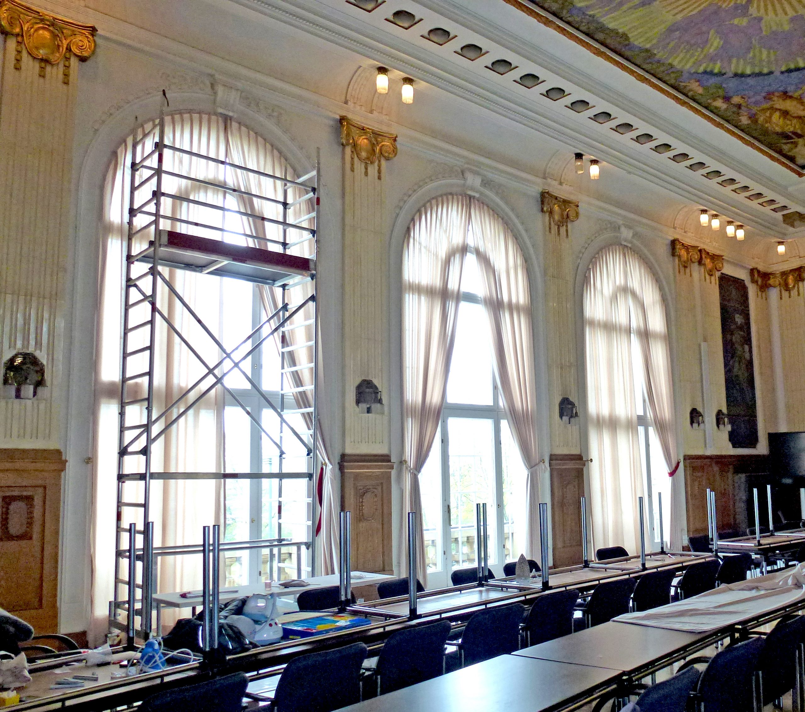 Dank der vielen Helfer, engagierten Mitarbeiter und hervorragenden Handwerksunternehmen erstrahlt der Plenarsaal der Bezirksregierung Düsseldorf ab sofort in neuem Glanz. In dieser Woche konnten die neuen Vorhänge aufgehängt werden. Der Raum erfährt eine deutliche Aufwertung, wirkt lichtdurchflutet und leicht.